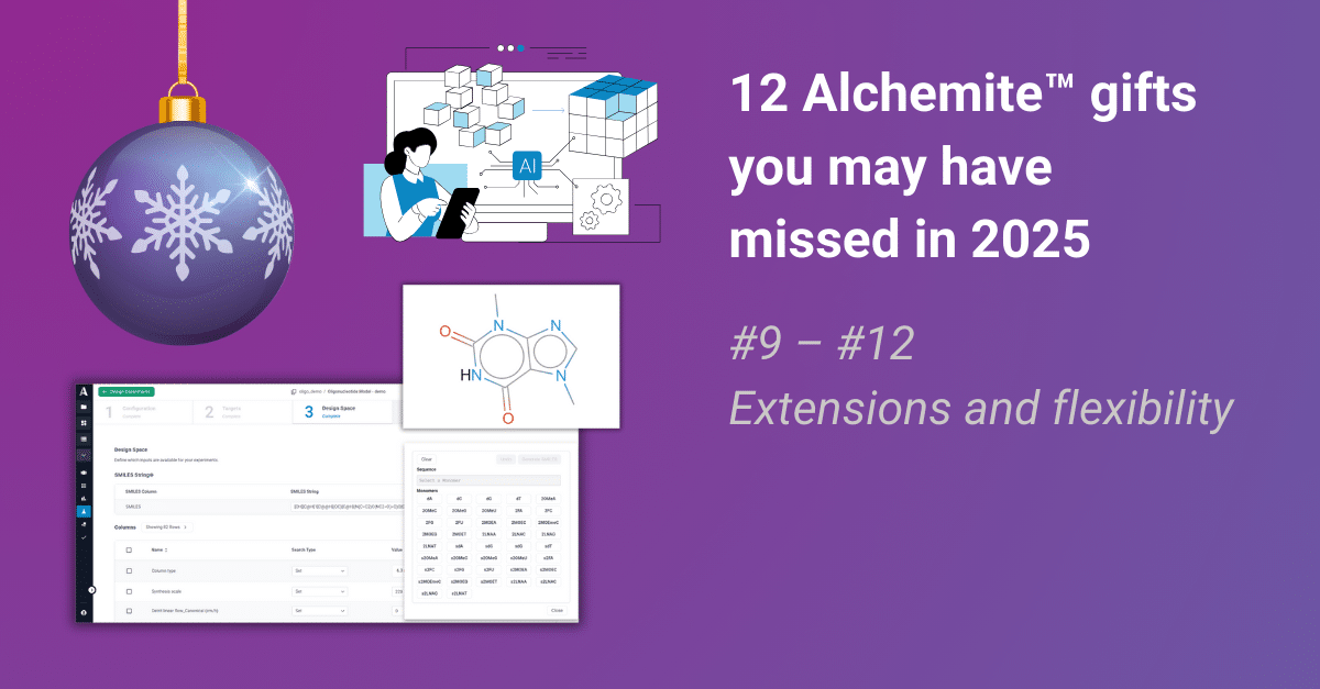 Alchemite™ for Oligonucleotide Manufacturing is a customized implementation of Alchemite™, developed and validated through a 2-year collaborative project, that makes it straightforward to apply machine learning to assist across the full manufacturing process for this important class of therapeutics, including synthesis, cleavage and deprotection, purification, and analytical method development.